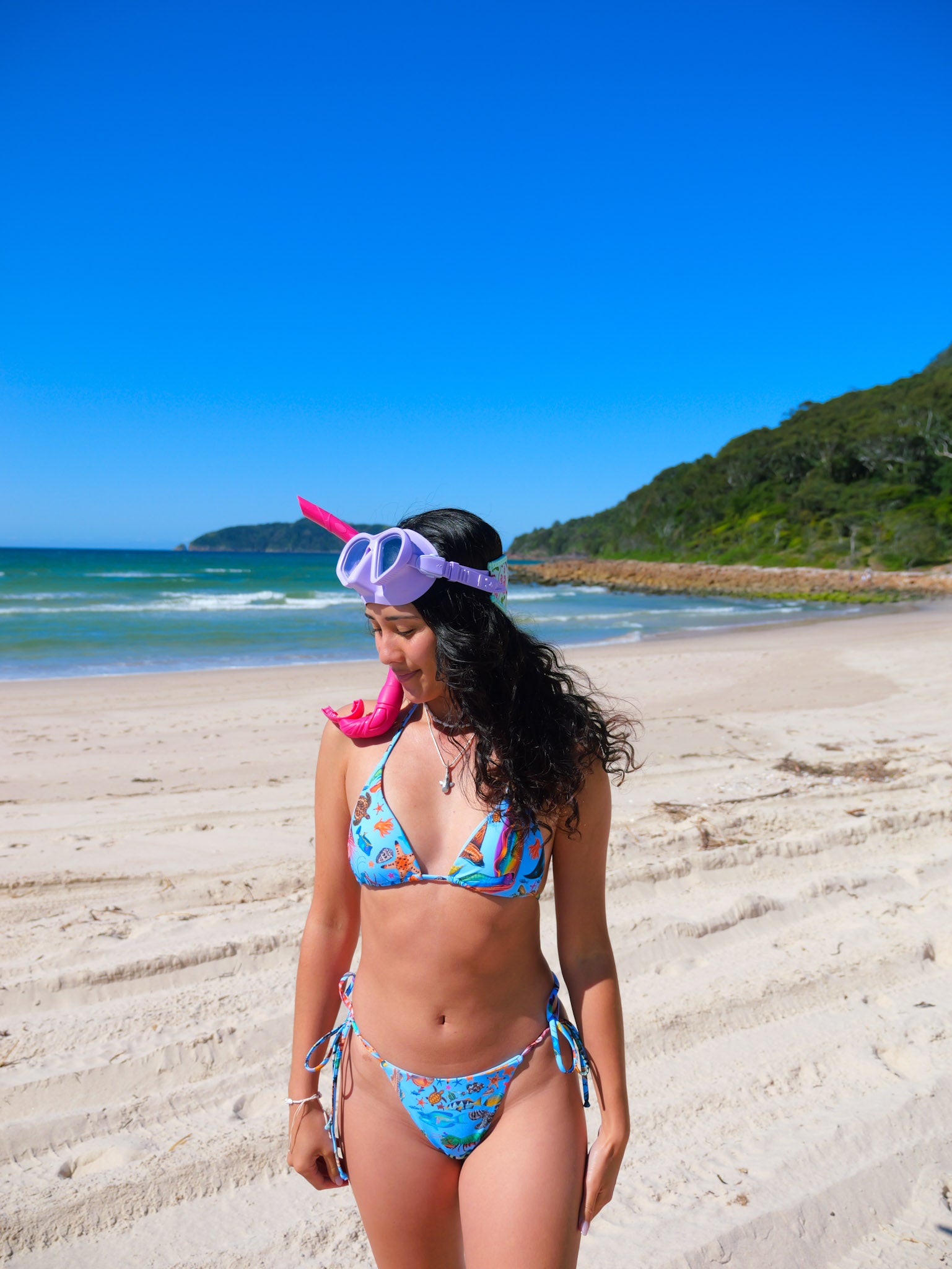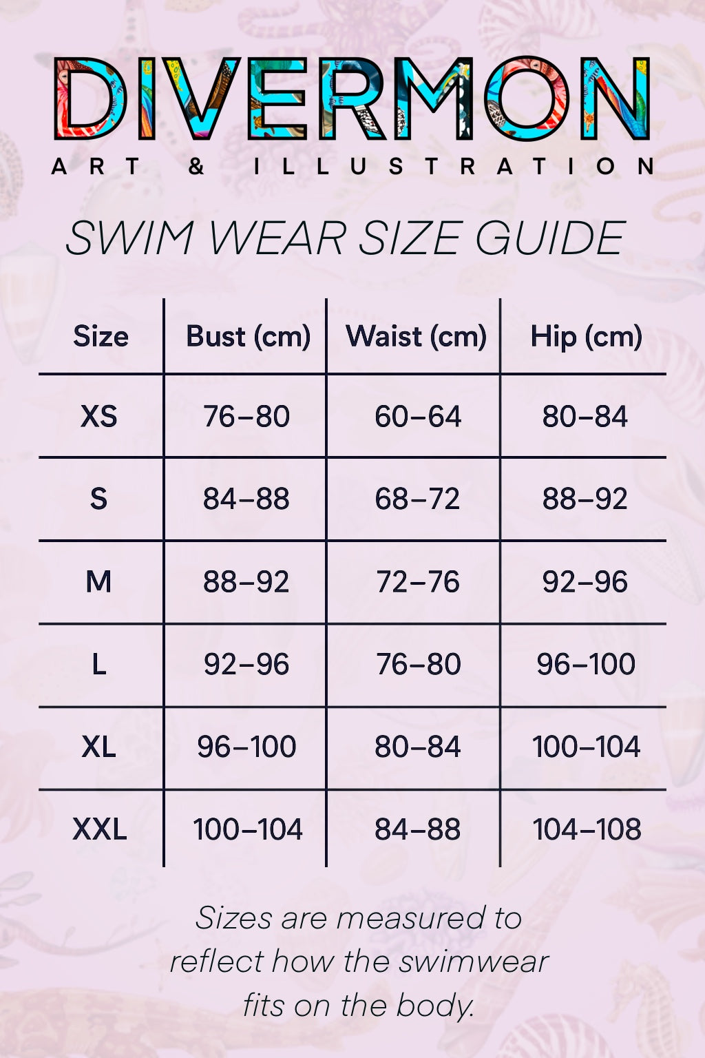A tie up bikini brought to life with DiverMon Art’s signature marine prints, each piece a wearable work of art celebrating the beauty of our oceans.
