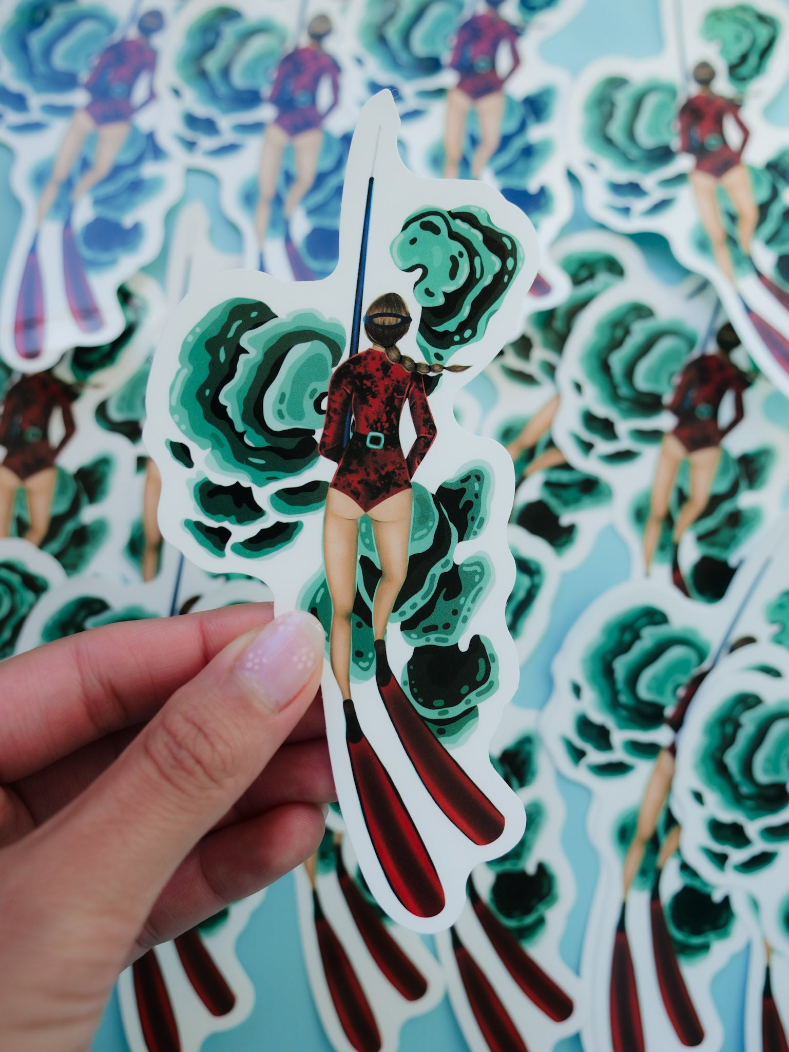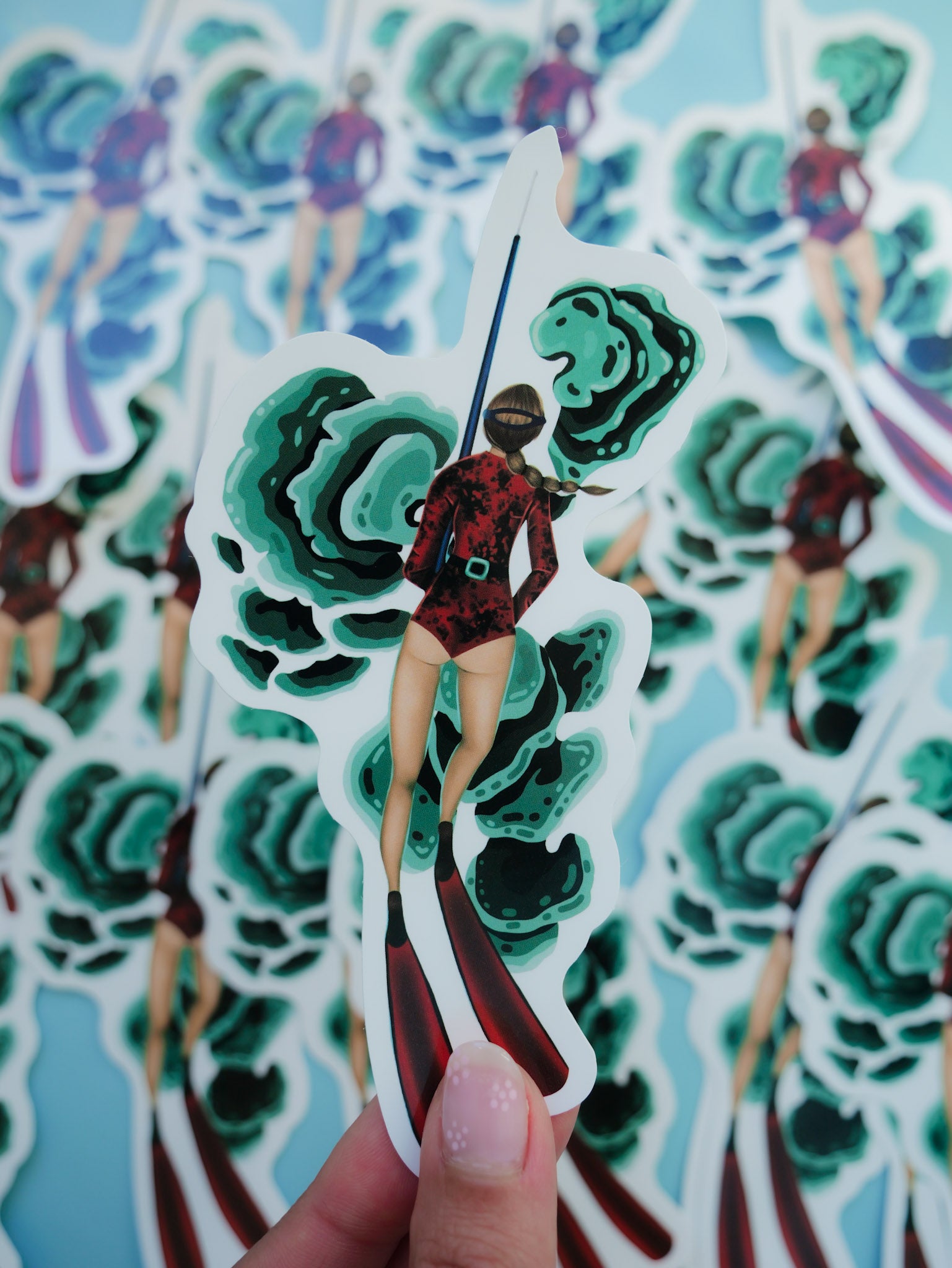 Dive into the world of marine life and decorate your belongings with the spearfishing girl sticker!